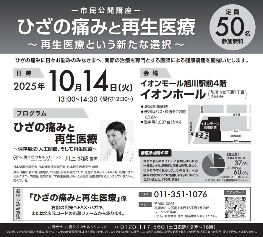 講演会 10月14日(火)「ひざの痛みの講演会 in 旭川」を開催させて頂きます