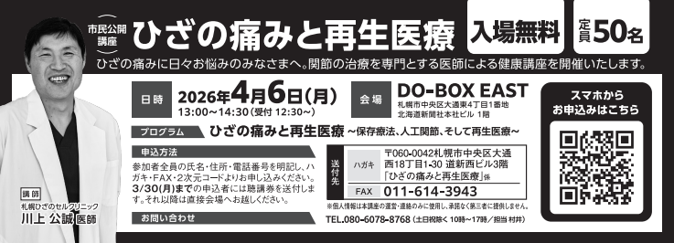 講演会 4月6日(月)「ひざの痛みと再生医療」を開催させて頂きます