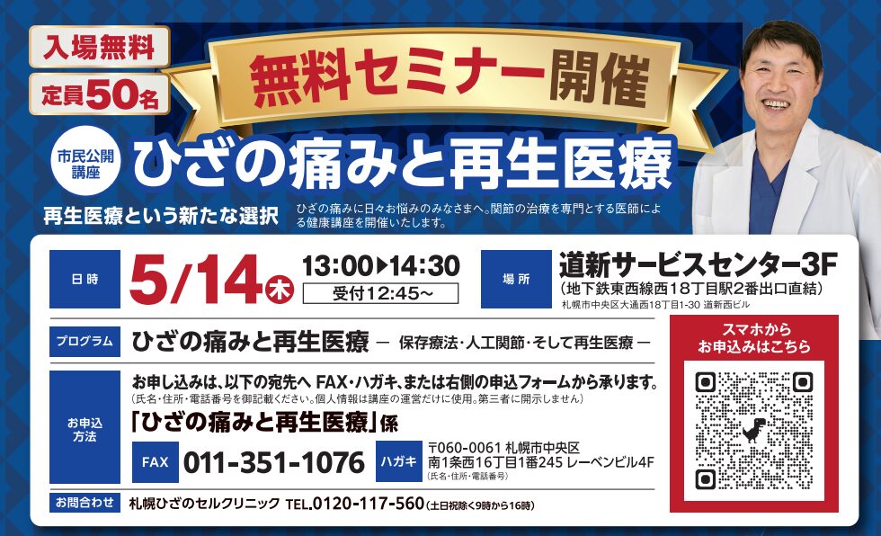 講演会 5月14日㈭「ひざの痛みの講演会 in 札幌」を開催させて頂きます