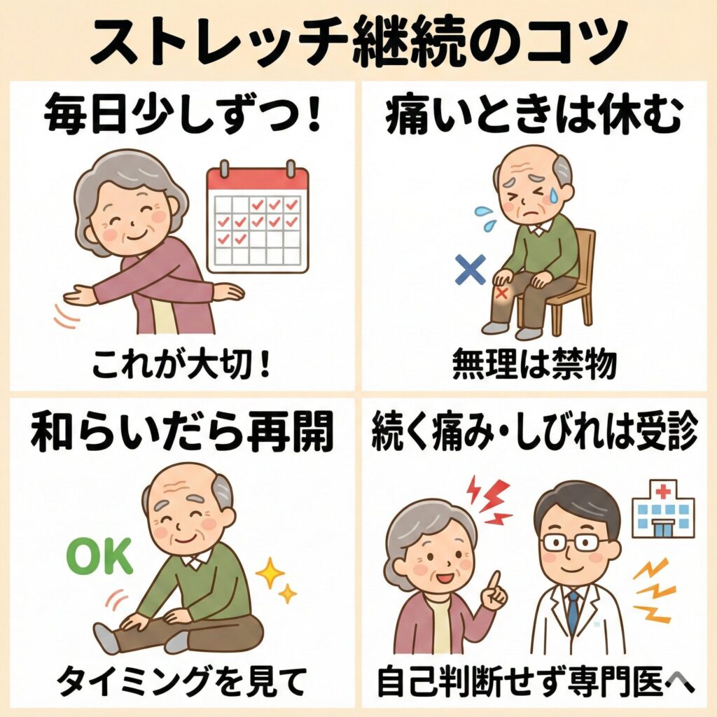 ストレッチは「毎日少しずつ続けること」が何よりも大切です。痛みが強いときは無理せず休み、痛みが和らいできたタイミングで再開するようにしましょう。