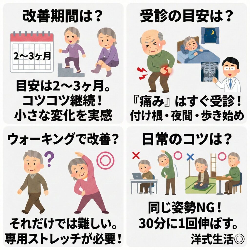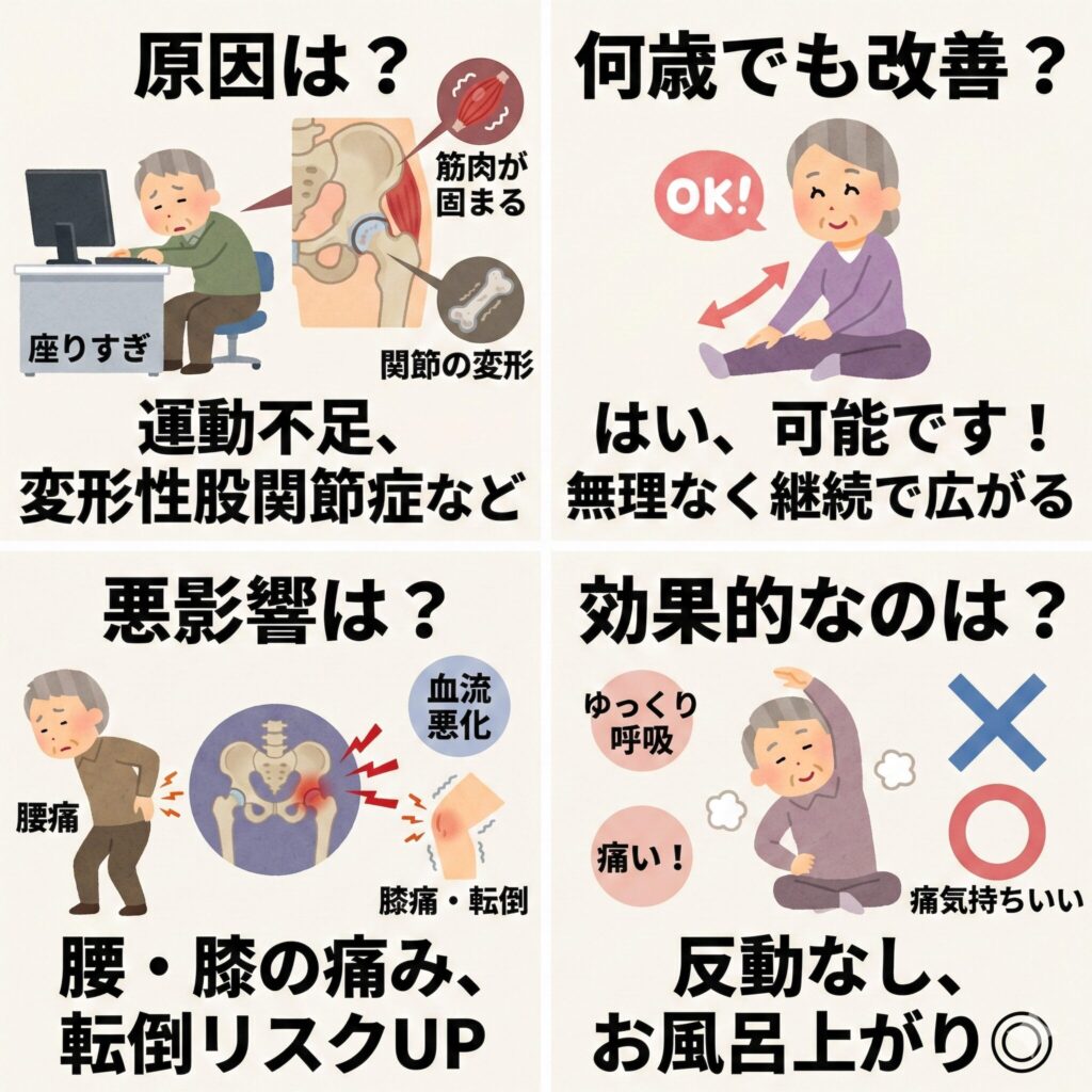 ここでは、整形外科専門医の視点から、股関節の硬さ改善について患者様より多くいただくご質問に分かりやすくお答えします。