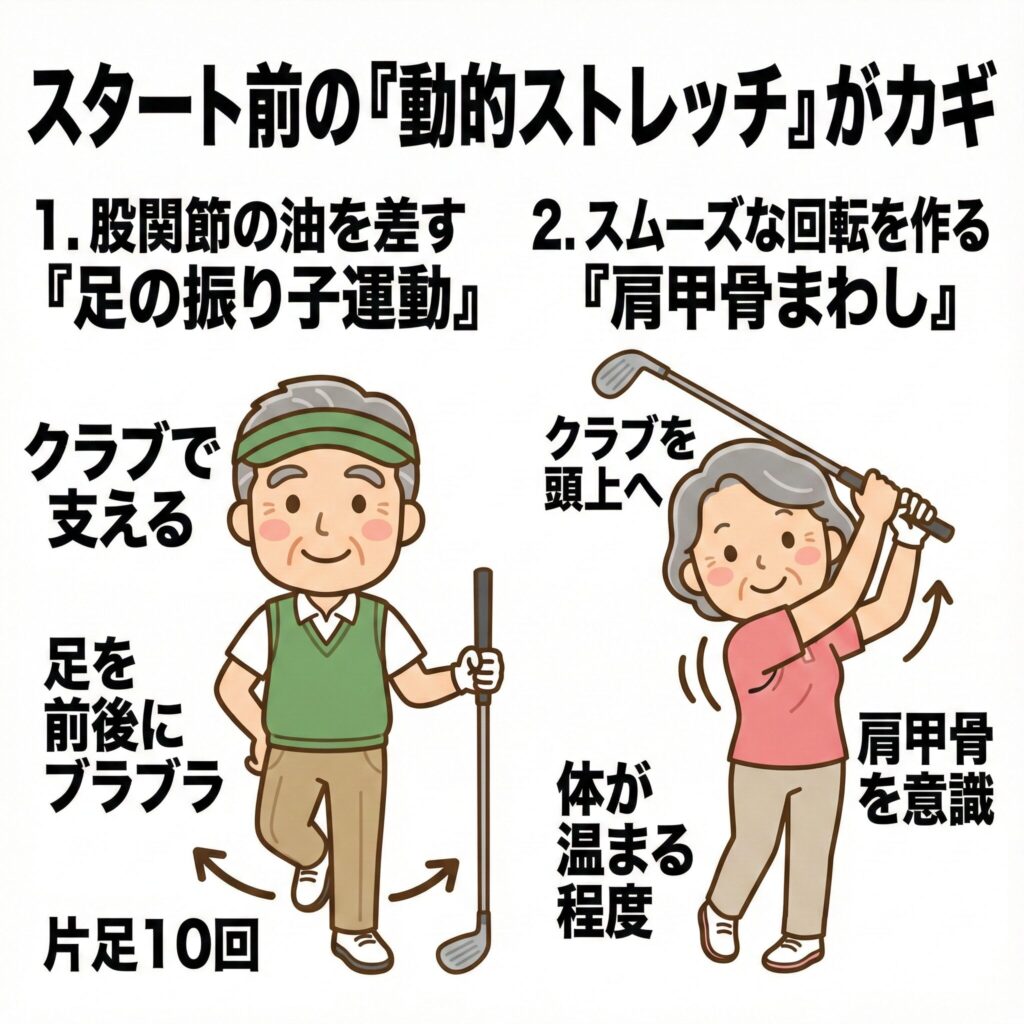 特に関節を守るために重要な、2つのポイントに絞ったウォームアップをご紹介します。クラブを杖代わりに支えにしながら行うと安全です。