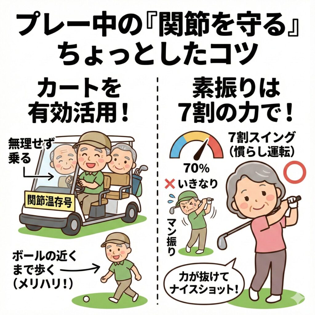 ウォームアップが完璧でも、プレー中に無理をしては意味がありません。整形外科医としておすすめしたい、ラウンド中の工夫をお伝えします。