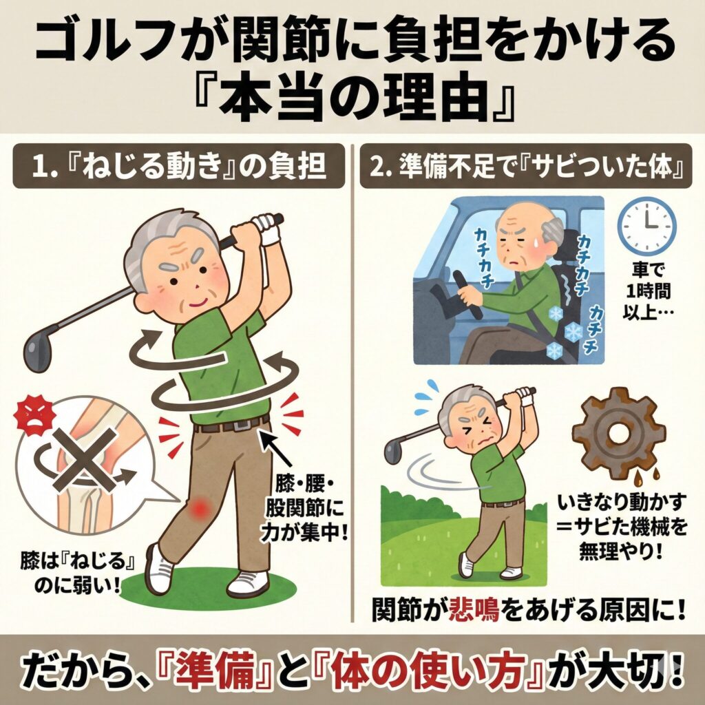 まずは、なぜゴルフが関節、特に膝や腰、股関節に負担をかけるのか、そのメカニズムを少しだけ解説しましょう。