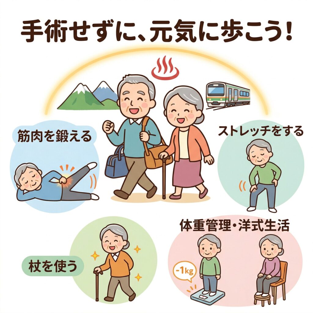 手術はあくまで最終手段です。その前にできることは、筋力トレーニング、生活環境の見直し、そして再生医療といった新しい選択肢まで、幅広く存在します。