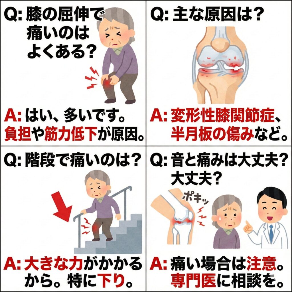 はい、多くの方が気になる点です。膝の屈伸時の痛みは、関節や軟骨、筋肉、靱帯などに負担がかかることで起こります。加齢による変化だけでなく、使い過ぎや筋力低下が原因になることも珍しくありません。