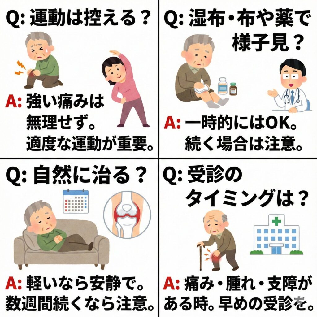 強い痛みがあるときは無理をしないことが大切です。ただし、完全に動かさないと筋力が落ち、かえって悪化することもあります。痛みの程度に合わせた適度な運動が重要です。