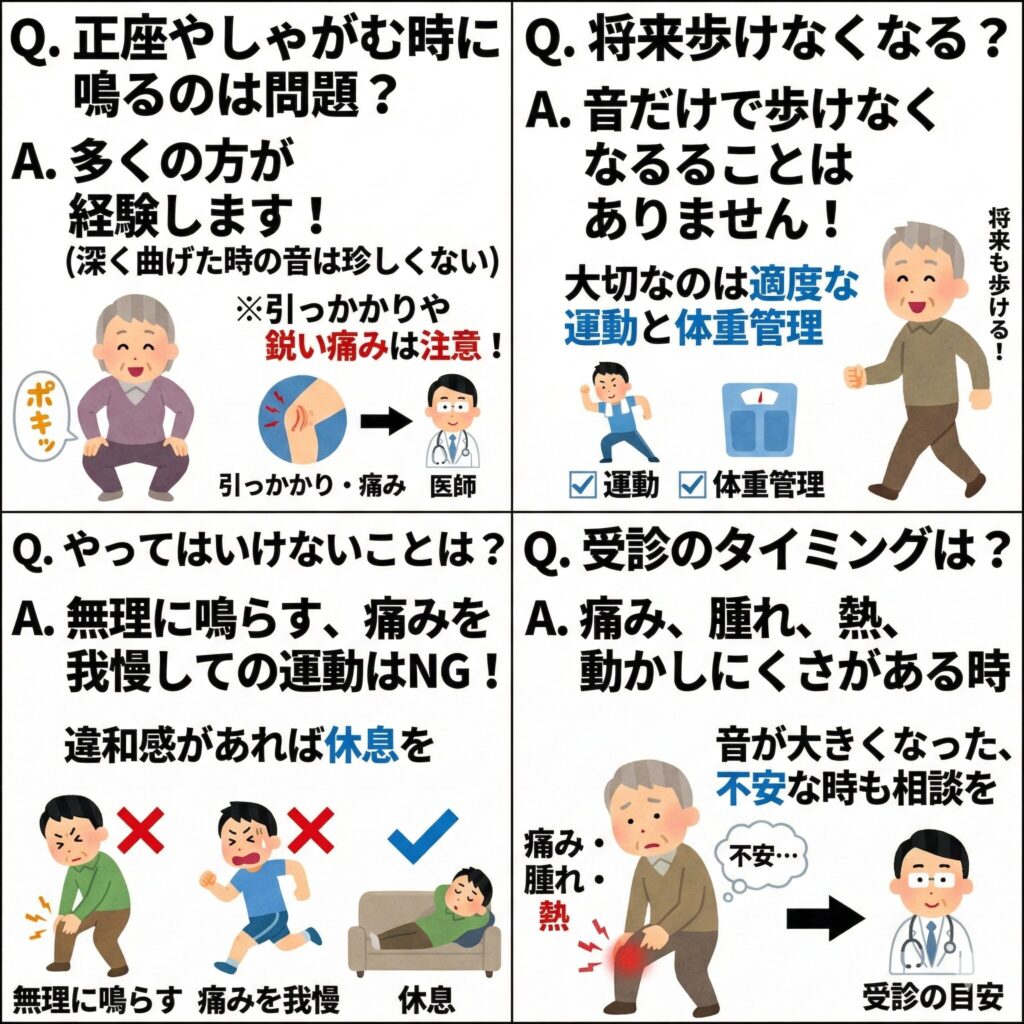 音がするだけで将来歩けなくなることはありません。多くの方が問題なく生活されています。ただし、筋力低下や体重増加が重なると膝への負担が増えるため、適度な運動と体重管理が大切です。