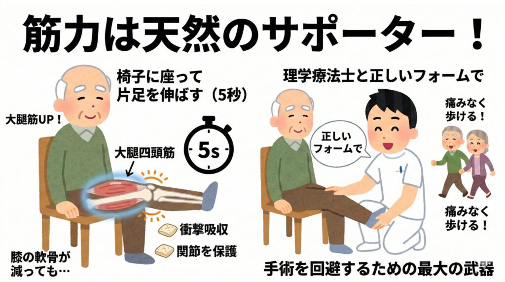 膝の軟骨がすり減っていても、膝を支える筋肉(特に太ももの前の大腿四頭筋)がしっかりしていれば、痛みを感じずに歩ける方はたくさんいらっしゃいます。筋肉が天然のサポーターの役割を果たし、骨と骨がぶつかる衝撃を吸収してくれるからです。