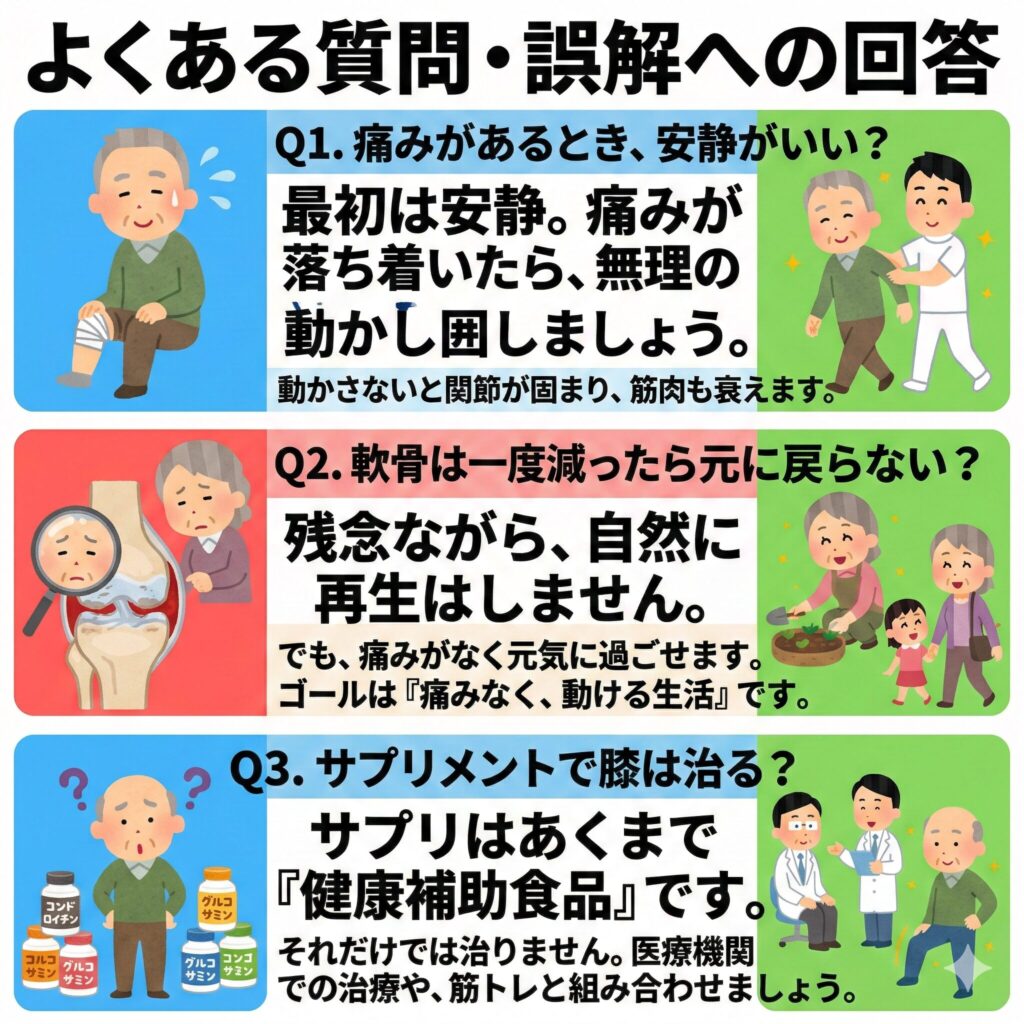 A3. コンドロイチンやグルコサミンなどのサプリメントは、あくまで「健康補助食品」です。 飲んでいることで安心感を得られたり、軽度の違和感が和らいだりする可能性はありますが、それだけで変形した関節が治るわけではありません。サプリメントに頼りすぎるのではなく、適切な医療機関での治療や、筋力トレーニングと組み合わせて活用するのが賢明です。