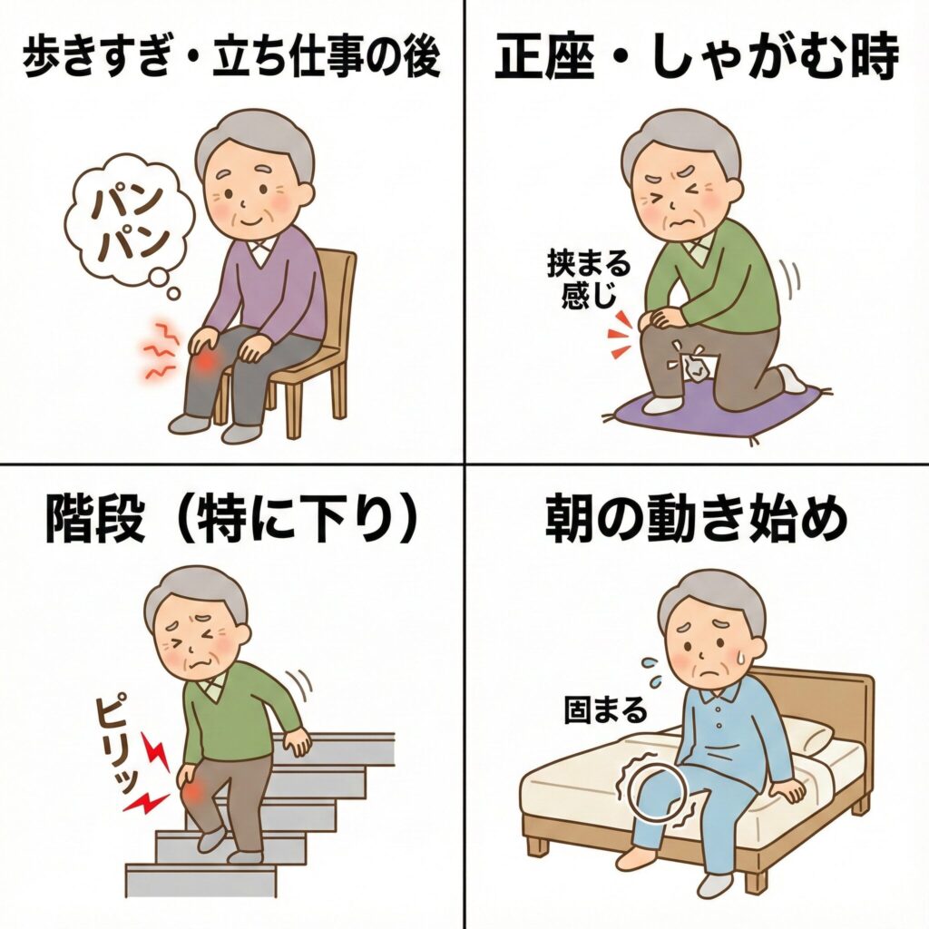 たくさん歩いた日の夜や翌朝に、膝の裏がパンパンに張っているような感覚。これは筋肉の疲労だけでなく、関節内部のトラブルが隠れているサインであることが多いです。