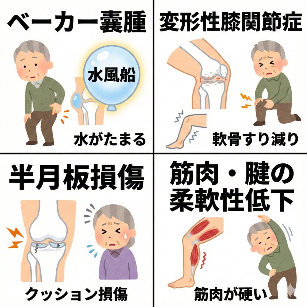 膝の裏が痛む原因は、一つではありません。医学的な観点から、50代から80代の方に特に多く見られる代表的な原因を4つ解説します。