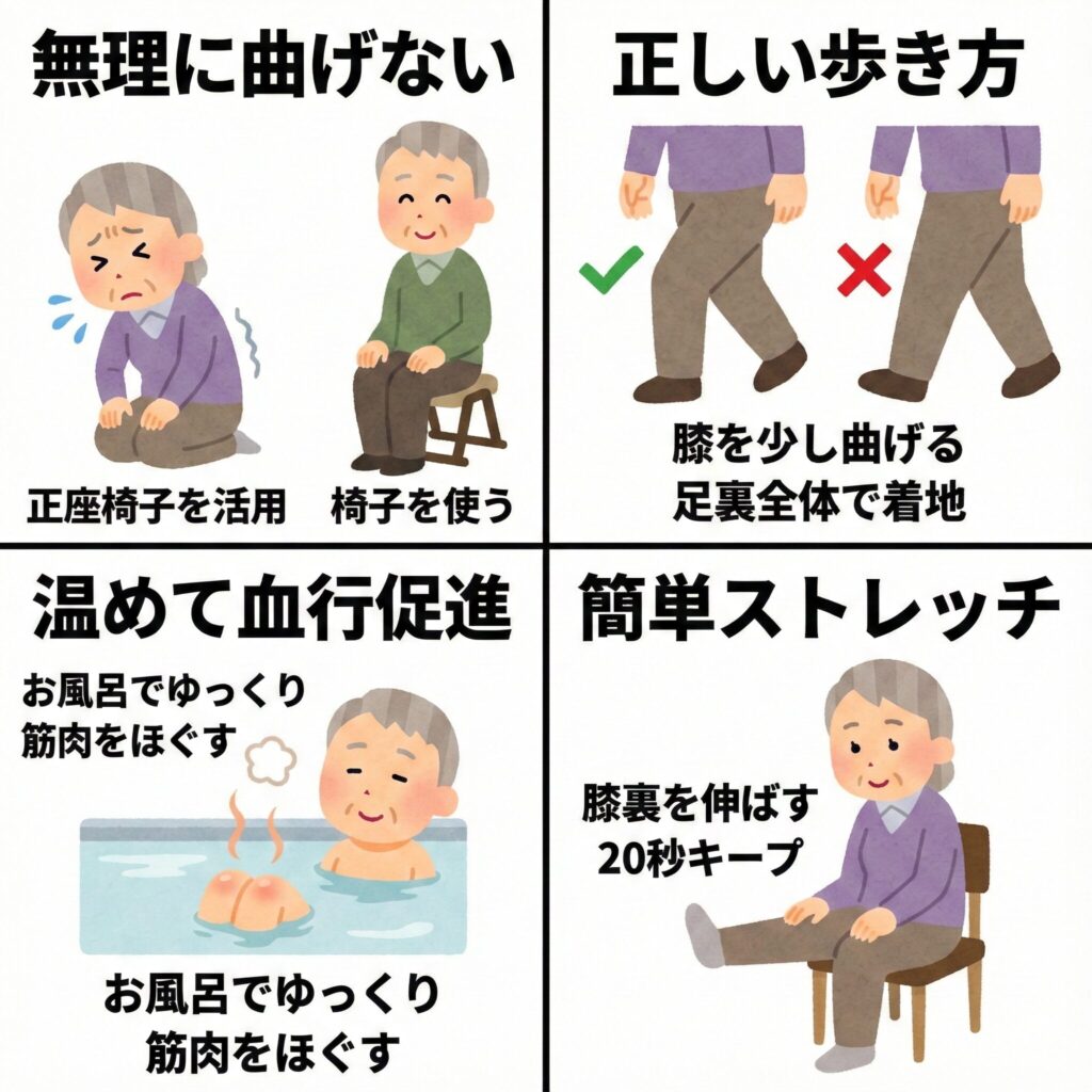 膝の裏の痛みを和らげ、悪化させないためには、日々のちょっとした工夫が大切です。今日から取り入れられるケアをご紹介します。