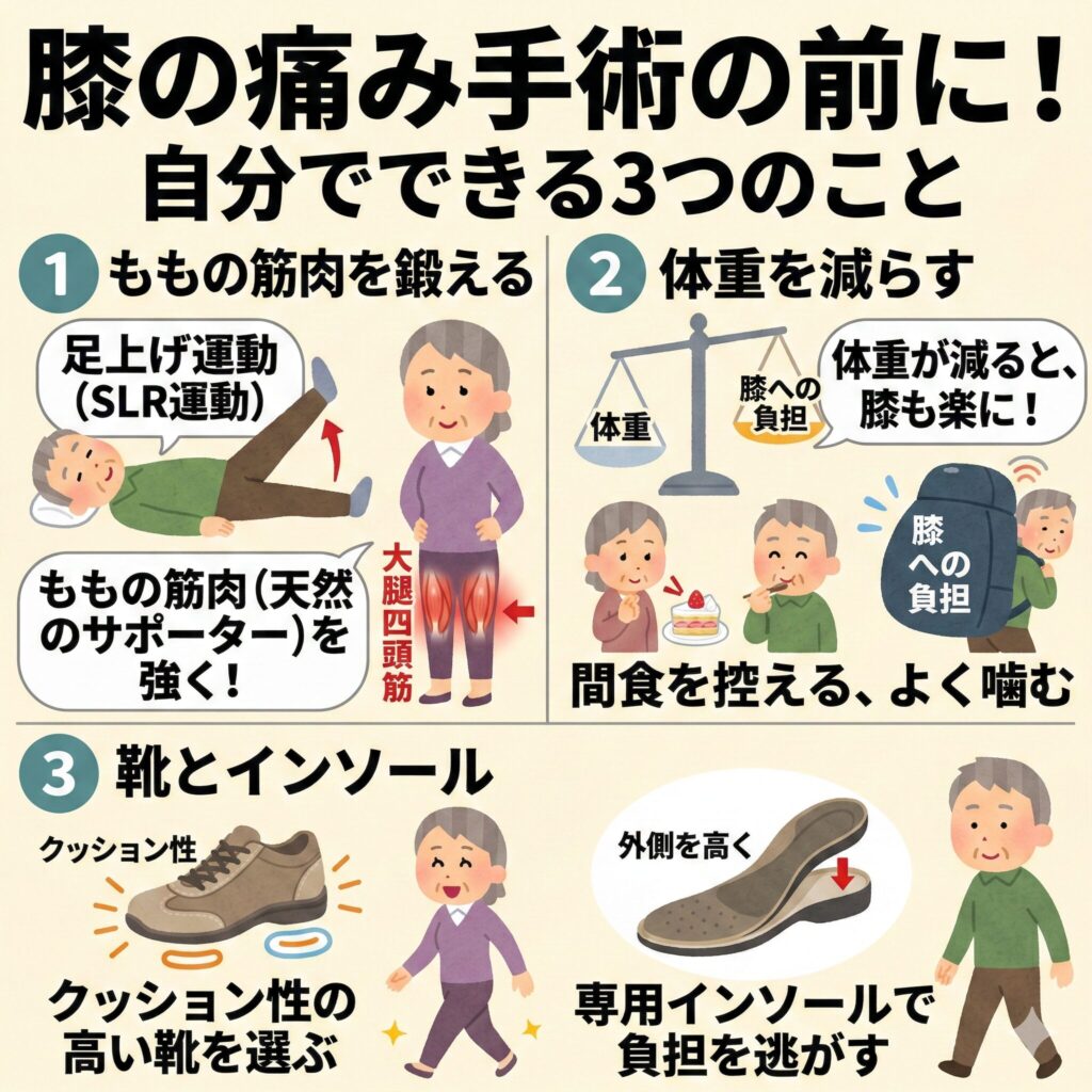 病院で手術を勧められたとしても、まずは保存療法を徹底的に行う価値があります。ここでは、注射に頼りすぎず、ご自身の体の機能を最大限に引き出す方法を中心にご紹介します。