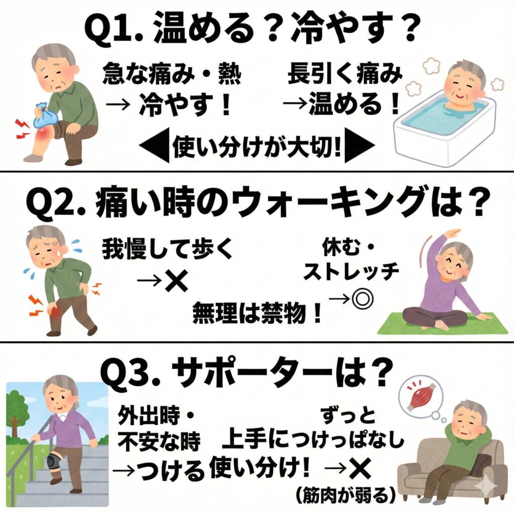A. 痛みを我慢してまで歩き続けるのはおすすめしません。 「歩かないと足が弱る」という不安はよくわかりますが、強い痛みがあるときに無理をすると、痛みをかばって腰や反対側の膝まで痛めてしまうことがあります。 痛みが強いときは、ウォーキングの距離を短くするか、一旦お休みしてストレッチに切り替えましょう。痛みが落ち着いてから、少しずつ距離を伸ばしていくのが近道です。