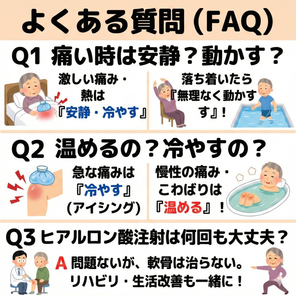 A3. 問題ありませんが、軟骨が修復することはないので、注射だけで全てを解決しようとするのではなく、リハビリや生活習慣の改善と組み合わせていくことが、膝の健康を長く保つ秘訣です。