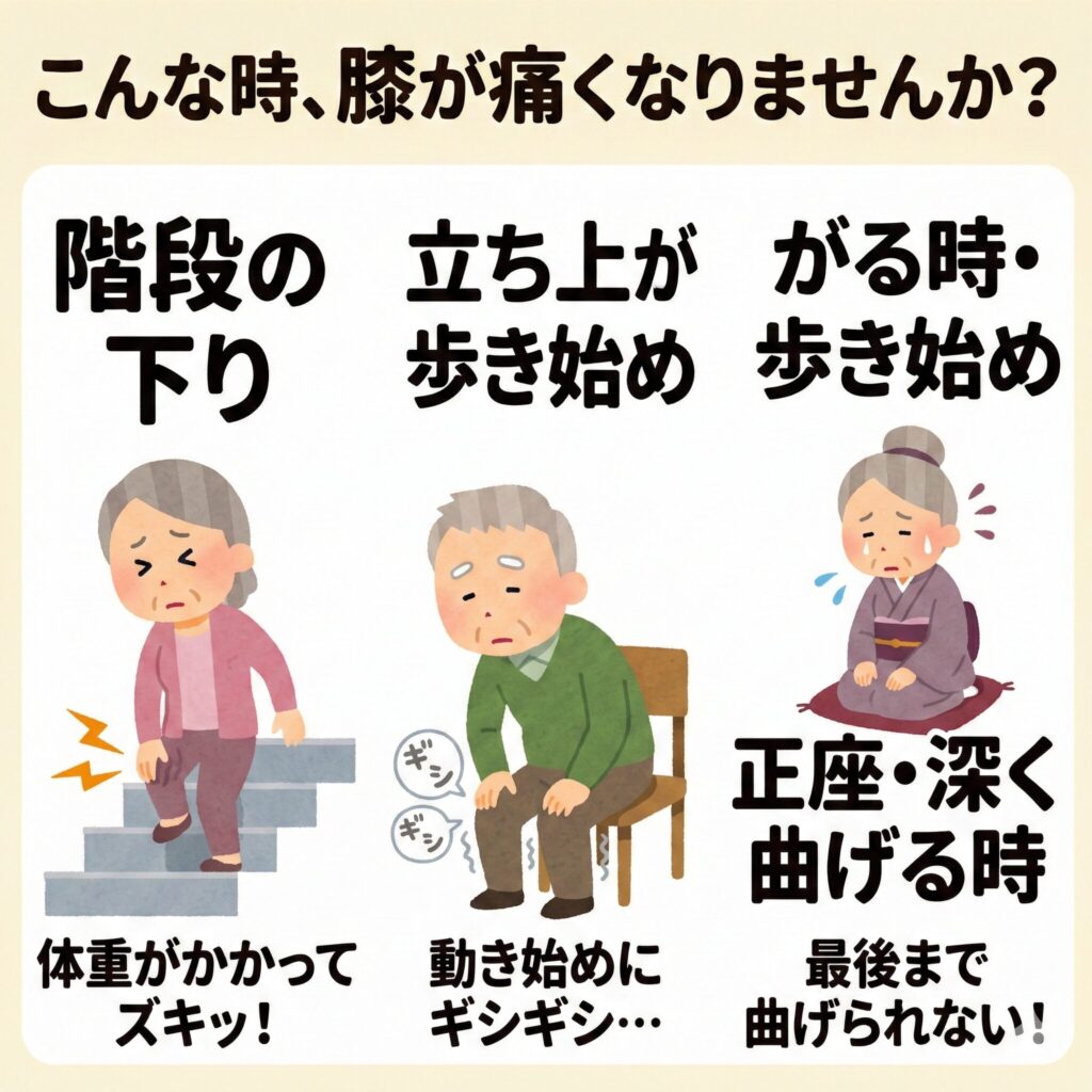 最近、階段の上り下りや椅子から立ち上がる時に、膝にヒヤッとするような痛みを感じることはありませんか。あるいは、以前は当たり前にできていた正座がつらくなったり、お風呂の椅子から立ち上がるのが億劫になったりしているかもしれません。
