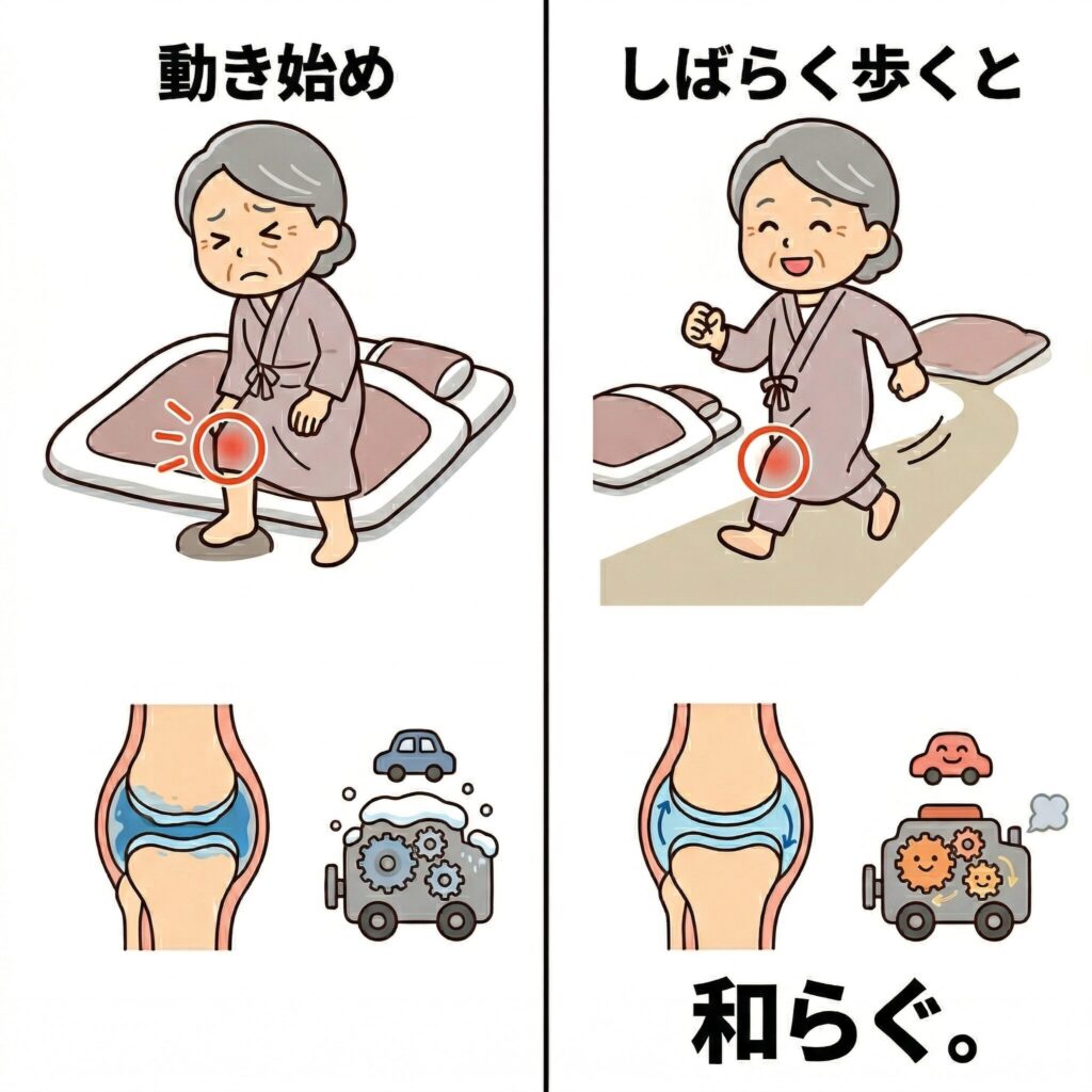 しかし、歩き始めて関節が動かされると、ポンプのような働きで潤滑油が広がり、摩擦が減って痛みが和らぎます。これを医学的には「始動時痛(しどうじつう)」と呼びます。