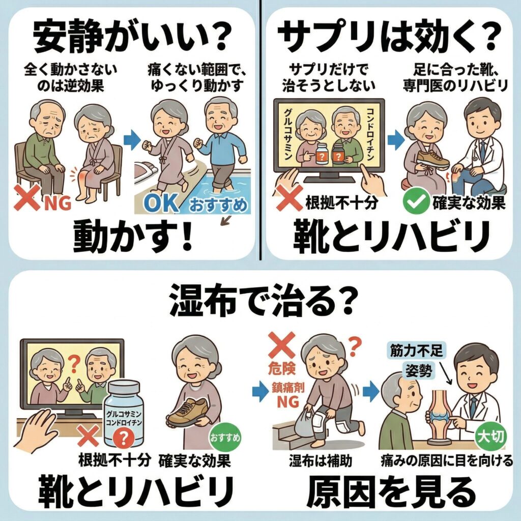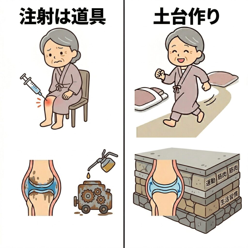 痛み止めの薬や注射は、あくまで「痛みを抑えて、体を動かしやすくするための道具」にすぎません。大切なのは、注射に頼り切るのではなく、自分の足で一生歩き続けるための「土台作り」をすることなのです。