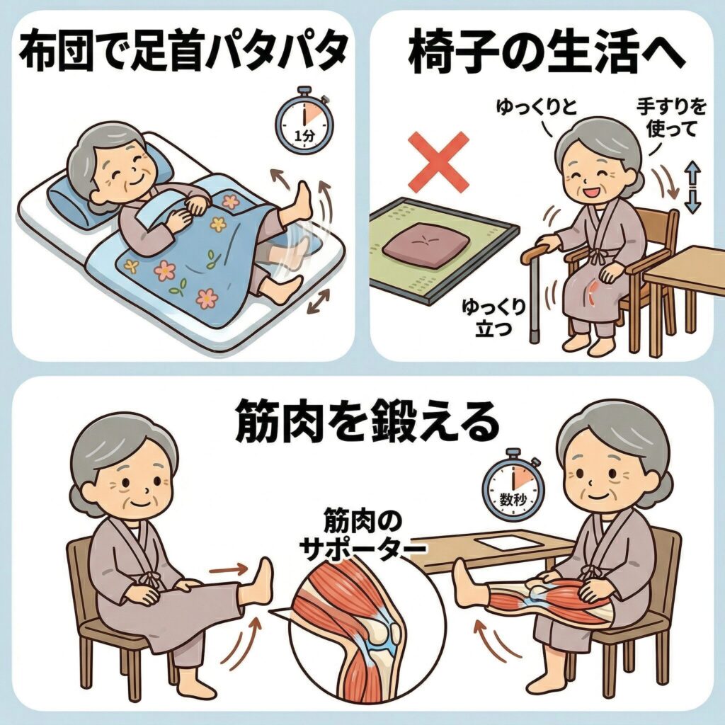 特に「立ち上がる」という動作は膝を酷使します。座面が高めの椅子を使い、立ち上がる時は手すりや膝に手を添えて、ゆっくりと動作を行うことを意識してください。急な動きは炎症を悪化させる一番の敵です。