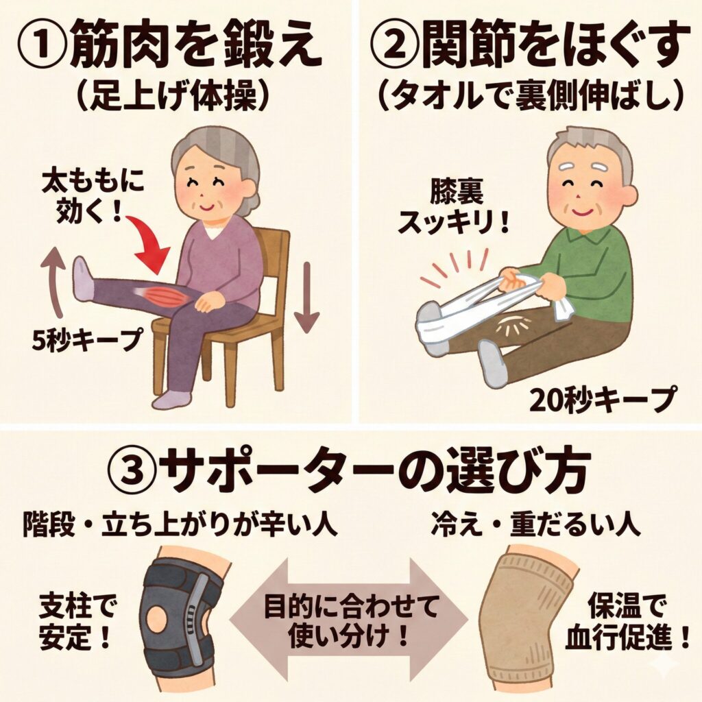 病院での治療も大切ですが、膝の健康を維持する主役は「毎日の生活」です。 自宅でできる保存療法(手術をしない治療法)の基本をご紹介します。