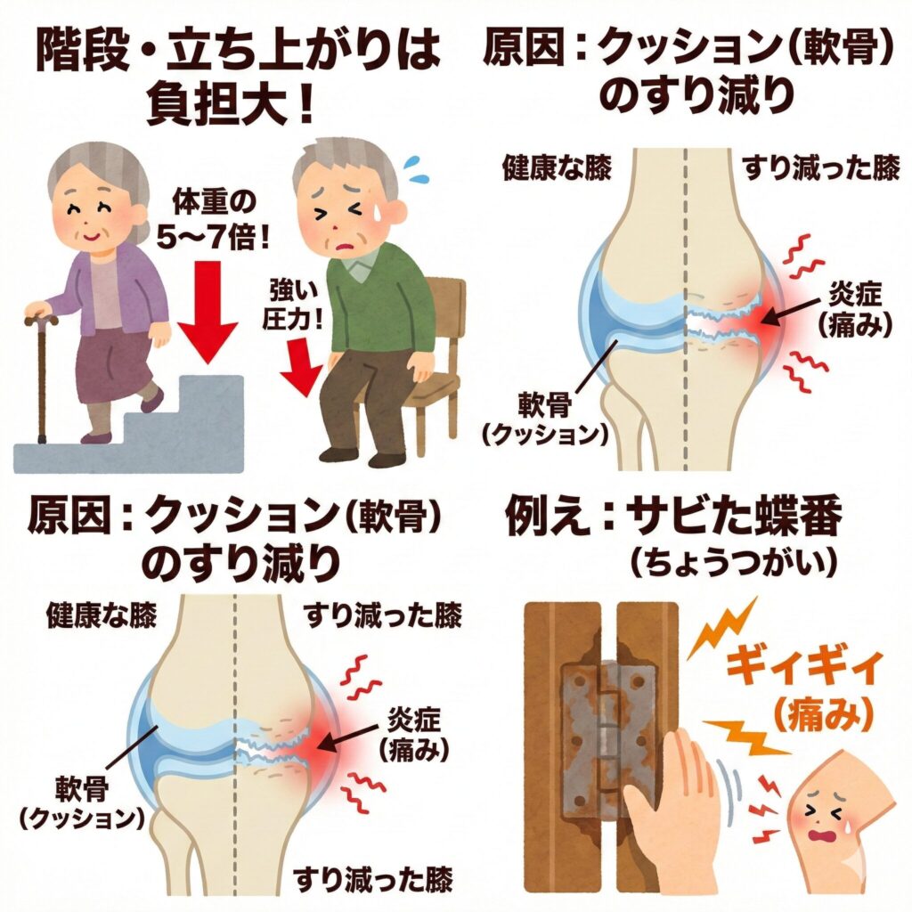 イメージしてみてください。 滑りの悪くなったドアの蝶番(ちょうつがい)を無理に動かそうとすると、ギィギィと音が鳴り、抵抗を感じますよね。 膝も同じで、クッションの機能が低下すると、滑らかな動きができなくなり、痛みというサインを出してくるのです。