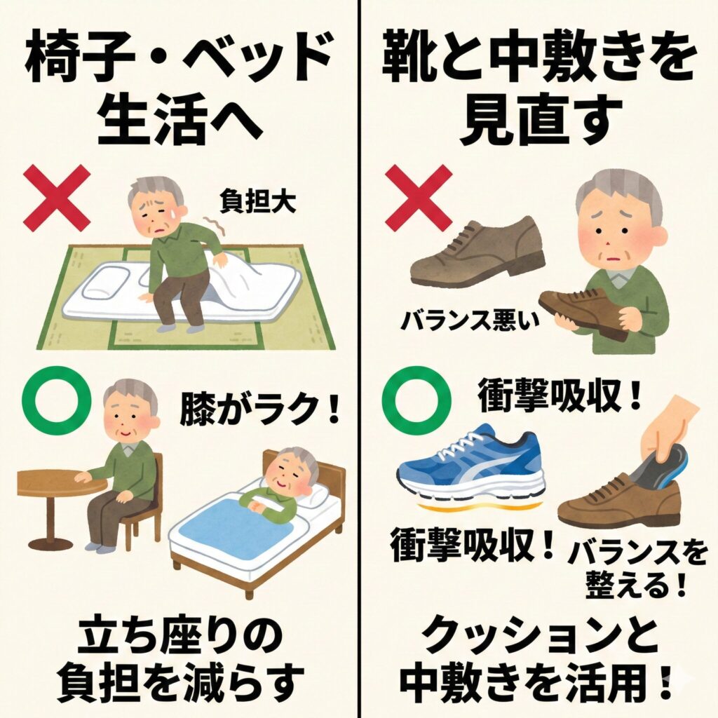 床に座る「畳の生活」は、立ち座りのたびに膝に強い負荷がかかります。 できるだけ椅子とテーブルの生活に変え、寝るときも布団ではなくベッドを使用することをおすすめします。