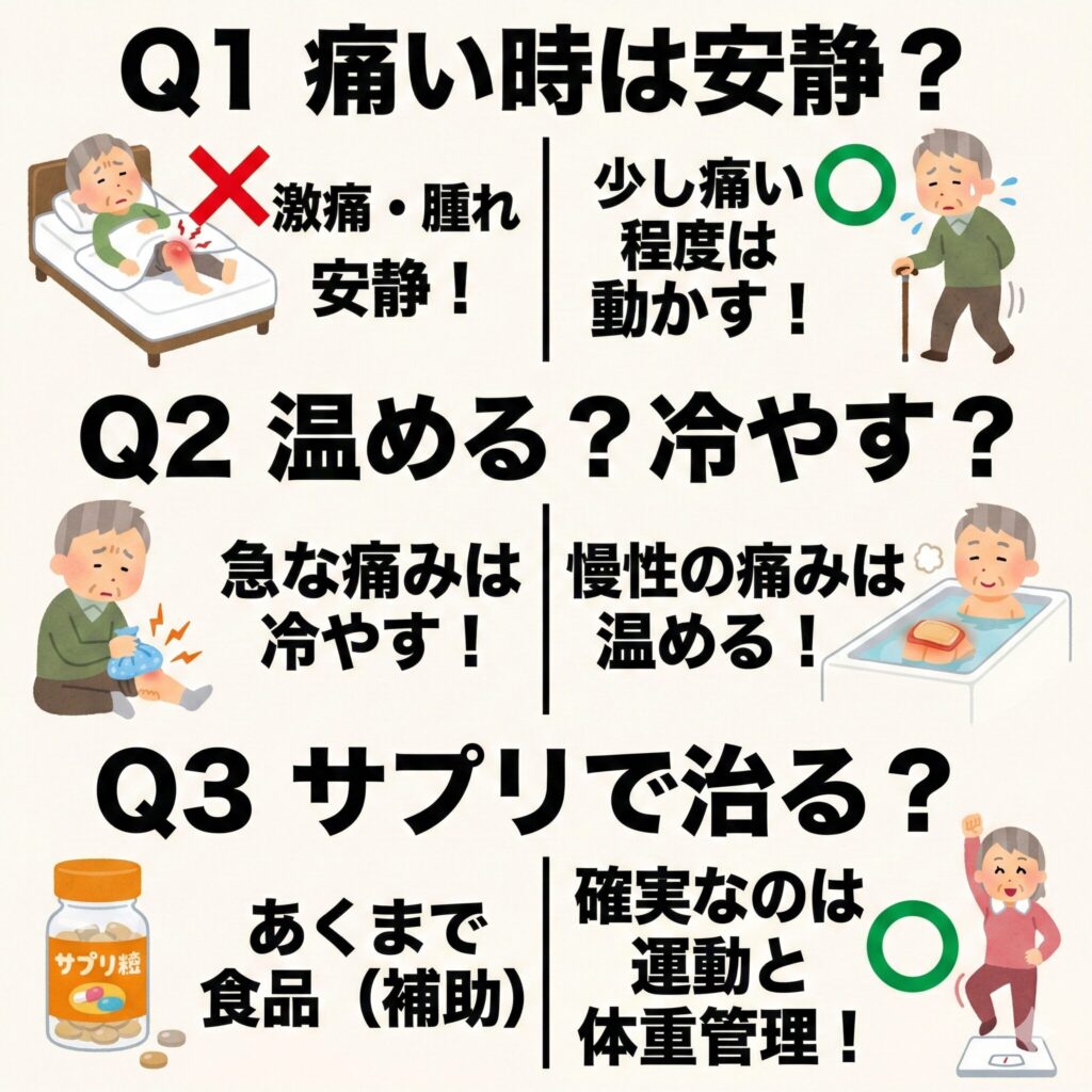 A:激しい腫れや熱、急激な激痛がある場合は安静が必要ですが、基本的には「痛みのない範囲で動かす」ことが推奨されます。 安静にしすぎると、膝を支える筋肉がさらに衰え、関節が固まってしまいます。 「少し痛いけれど、動かしているうちに楽になる」程度であれば、無理のない範囲で散歩や体操を続けましょう。