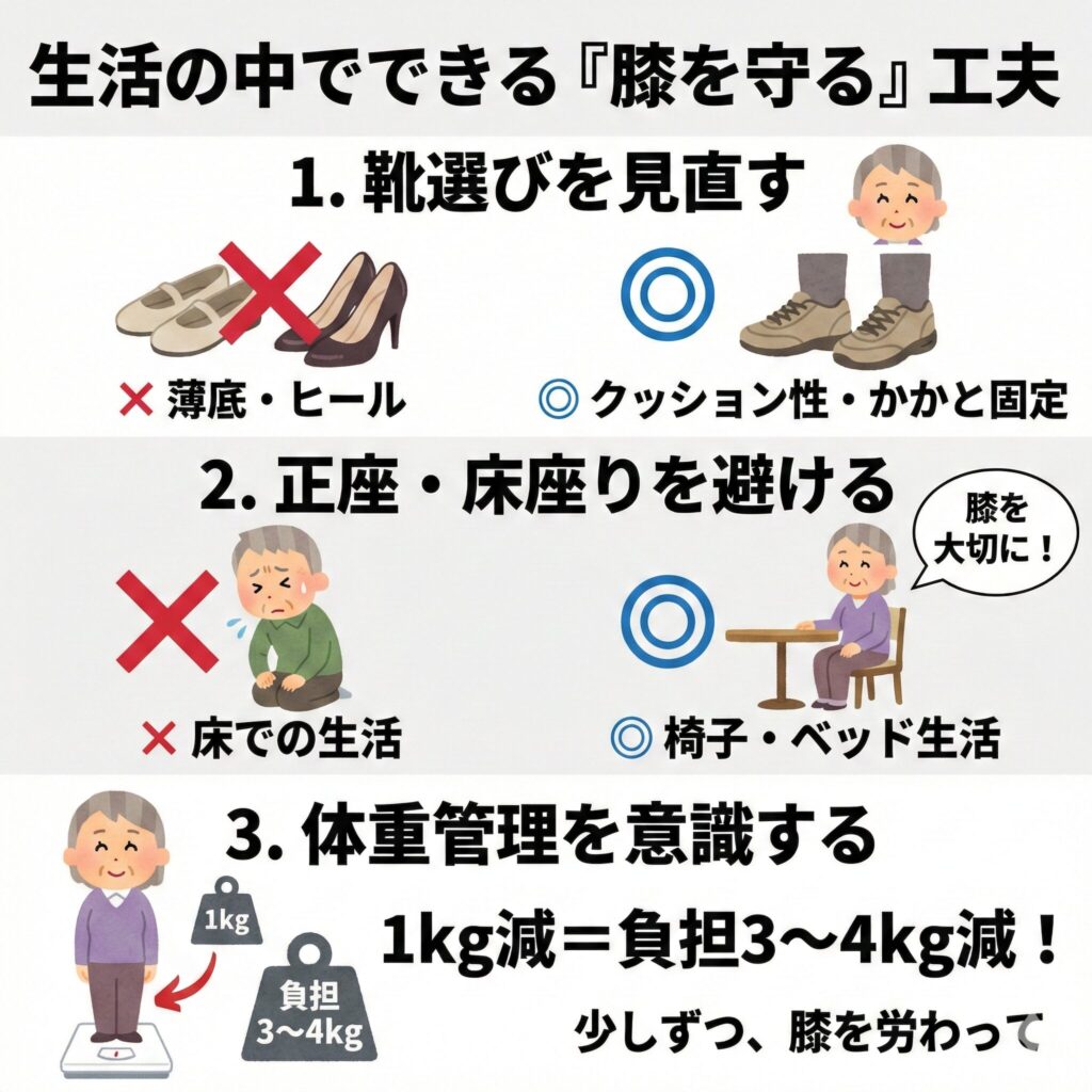 治療と並行して、日々の生活を少し見直すだけで、膝への負担は驚くほど変わります。