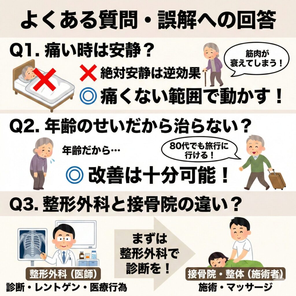 A. 確かに年齢とともに変化は起きますが、「治らない」わけではありません。 医学的に「変形」自体を完全に元通りにするのは難しい場合もありますが、「痛みを取り除くこと」や「今より楽に歩けるようになること」は十分に可能です。 80代からリハビリを始めて、再び旅行に行けるようになった患者さんはたくさんいらっしゃいます。