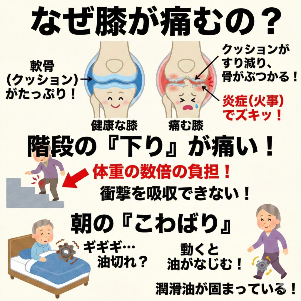 よく「階段の上りより下りのほうが辛い」という声を耳にします。 実はこれには医学的な理由があります。 下る動作のとき、膝には体重の数倍もの負荷がかかります。 すり減ったクッションではその衝撃を逃がしきれず、痛みとして脳に伝わるのです。