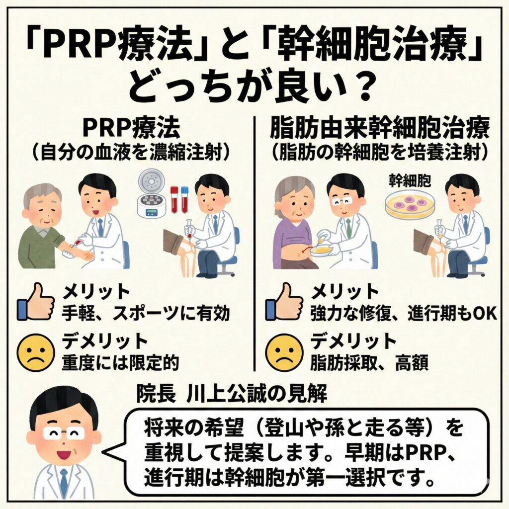 「当院では、軟骨の摩耗状態だけでなく、患者様の『将来どうなりたいか(趣味の登山を続けたい、孫と走りたい等)』を重視して治療法を提案しています。早期であればPRP、進行期であれば幹細胞治療が第一選択となることが多いです。」