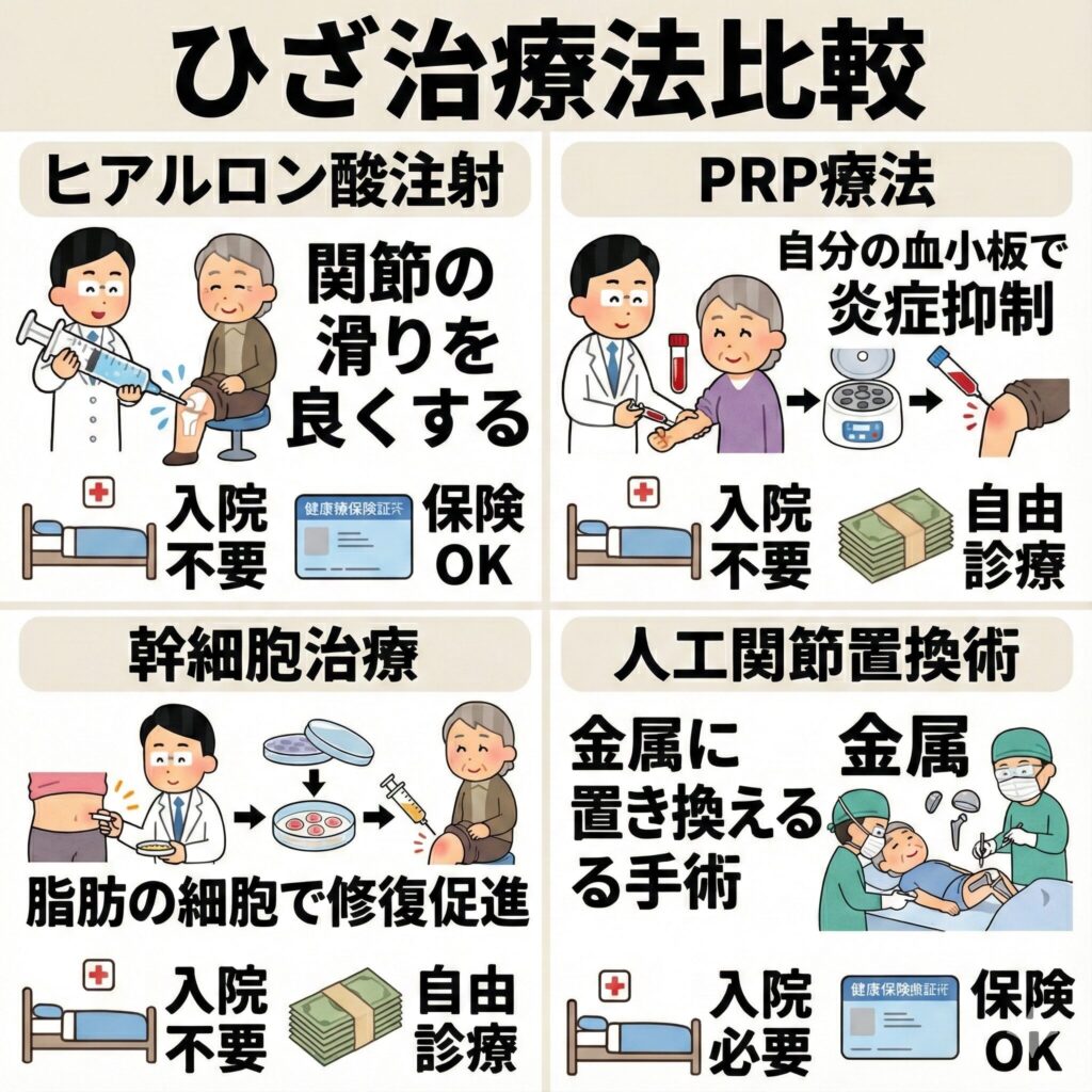 | ヒアルロン酸注射 | 関節の滑りを良くする | 不要 | あり | 軽度の痛み、一時的な緩和希望 |