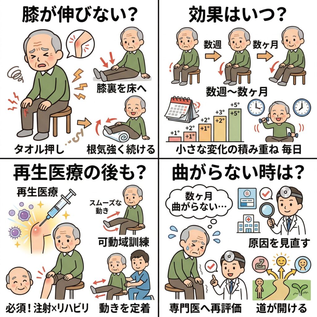 はい、非常に重要です。再生医療は関節内の環境を整え、組織の修復を促す素晴らしい治療ですが、それだけで膝の動きが100%戻るわけではありません。注射などの治療と並行して可動域訓練を行うことで、新しく整えられた関節環境を最大限に活かし、スムーズな動きを定着させることができます。再生医療によって痛みが和らいだタイミングこそ、訓練を行う絶好のチャンスとも言えるでしょう。