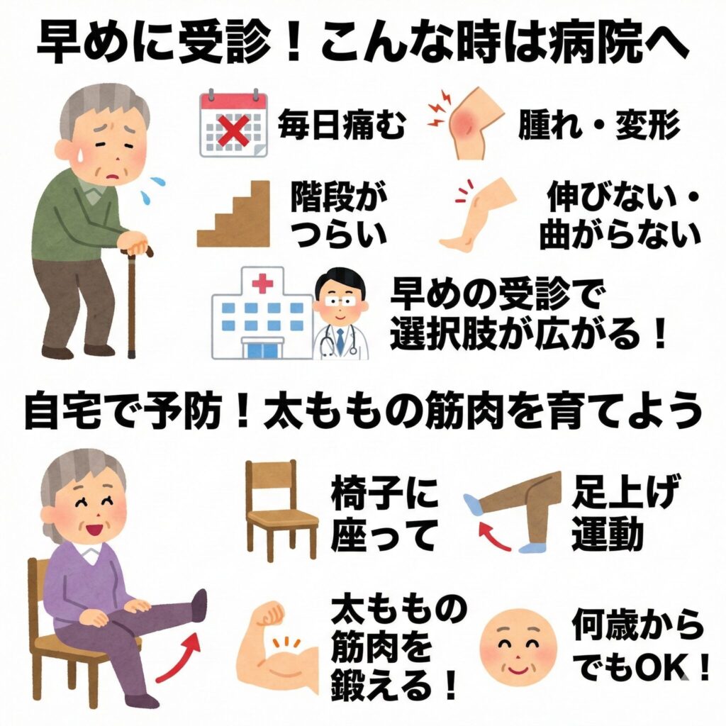 自宅でできる予防策としては、やはり「太ももの筋肉を育てること」が一番の近道です。 膝に負担をかけない椅子に座ったままでの足上げ運動など、無理のない範囲で筋肉を刺激してあげましょう。筋肉は、何歳からでも鍛えることができます。
