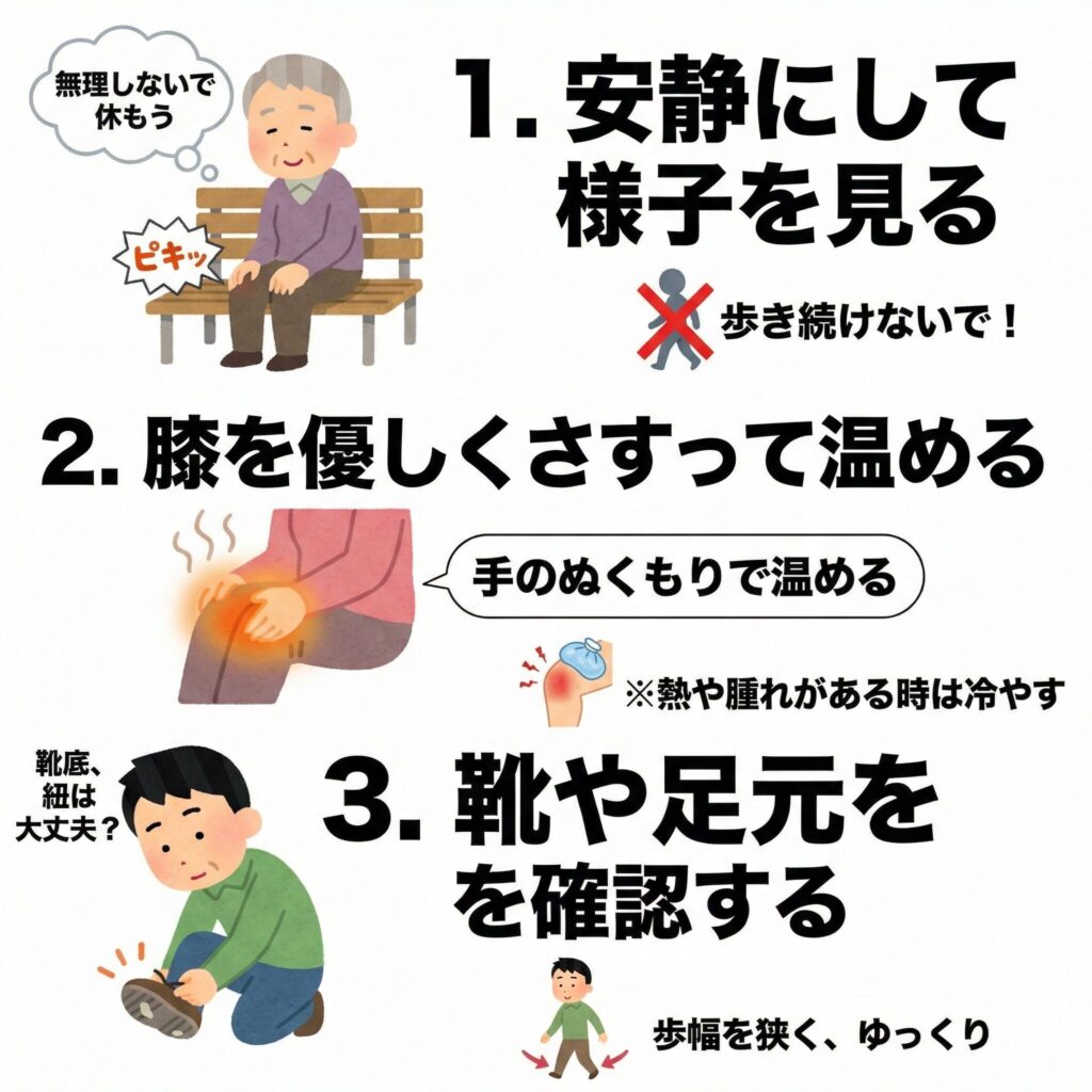 痛みが出た瞬間に無理をして歩き続けるのは禁物です。まずは近くのベンチや椅子に座り、膝への体重を逃がしてあげましょう。 「歩けるから大丈夫」と過信して、その日のノルマであるウォーキングを完遂しようとする真面目な方もいらっしゃいますが、炎症を悪化させる原因になります。その場では1〜2分休んで、痛みが落ち着くのを待ちましょう。