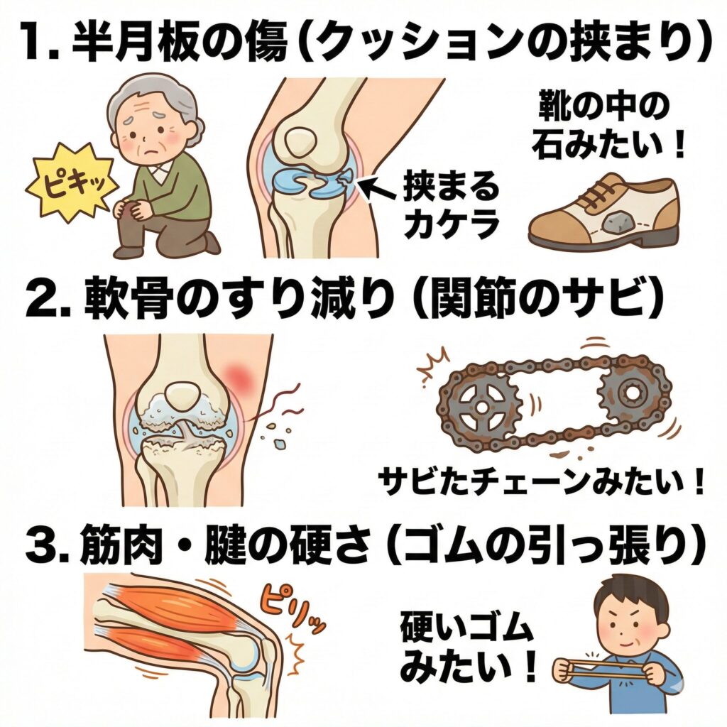 この痛みは、単なる老化の証ではありません。半月板の小さな引っかかりや、軟骨の摩耗、筋肉の疲れなど、具体的な理由があって起きています。そして、それらには必ず対処法があります。