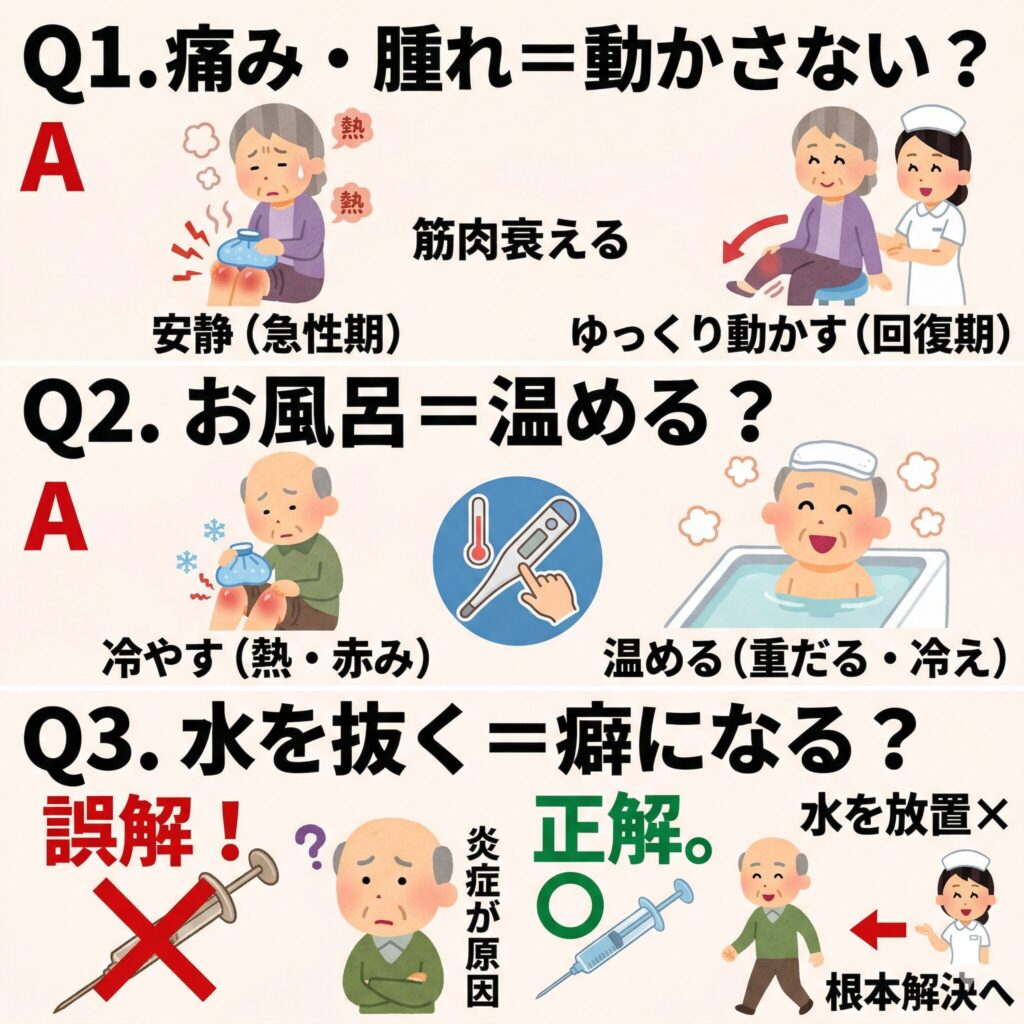 膝に水が溜まることに関して、患者さんからよく受ける質問にお答えします。