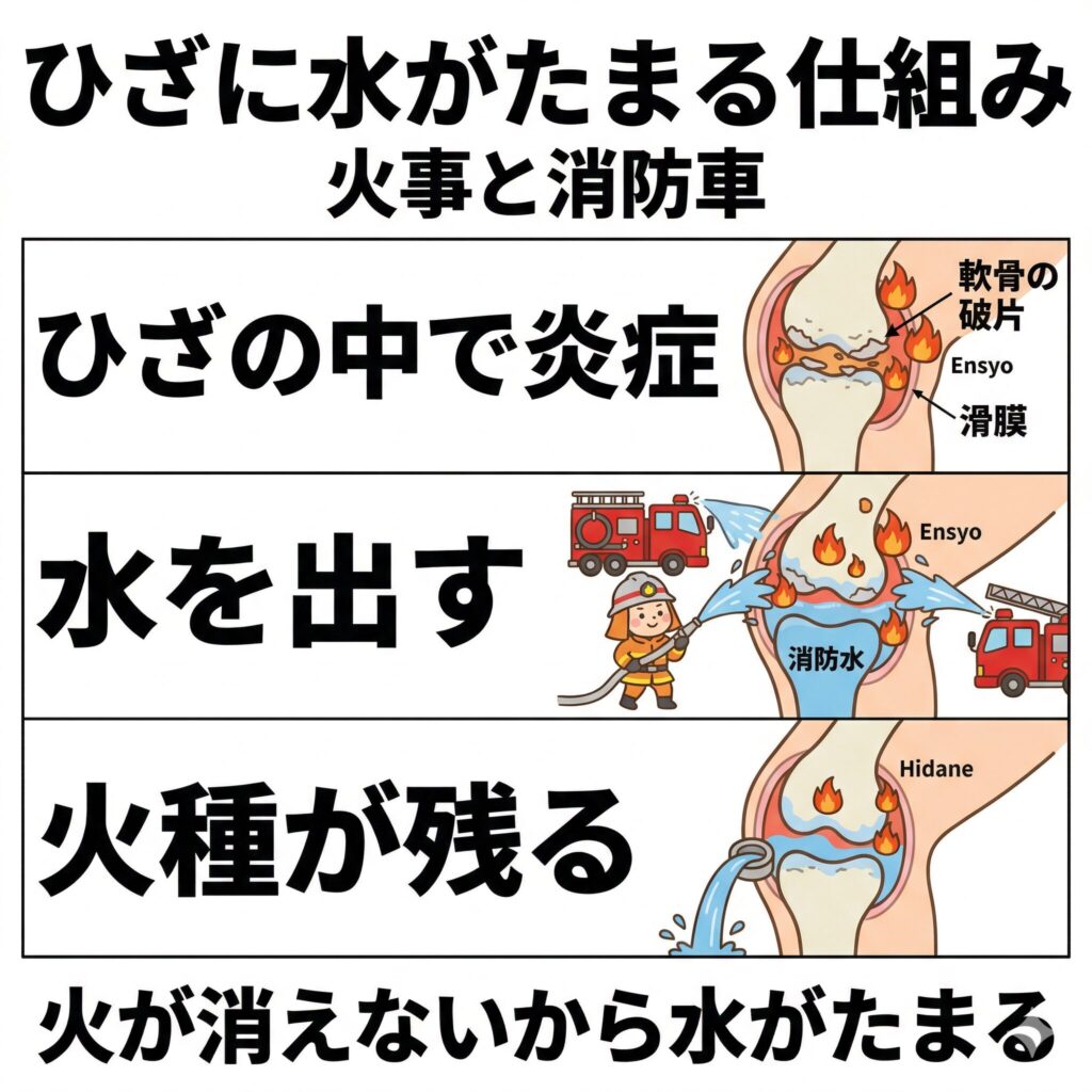 火事が起きると、体はその熱を冷まし、炎症を鎮めようとして、大量の関節液を分泌します。これが「水が溜まった」状態です。つまり、水は膝を守ろうとして集まってきた消防水なのです。