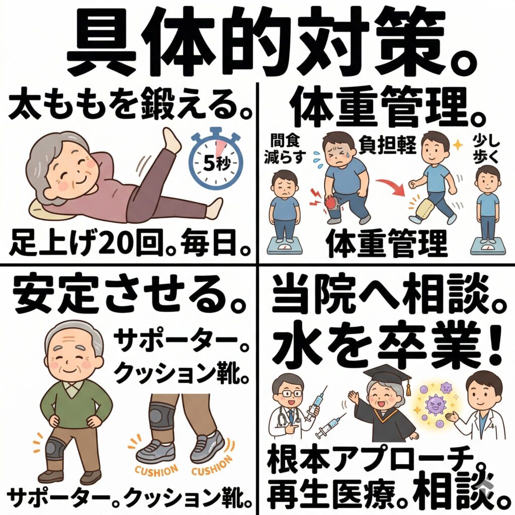 筋肉を鍛え、生活習慣を見直し、そして必要であれば再生医療のような新しい知見を取り入れる。そうすることで、繰り返す腫れや痛みから解放され、再び自分の足で力強く歩ける日は必ずやってきます。