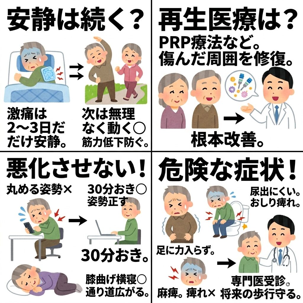 激しい痛みがある「急性期」の数日間は安静が大切です。しかし、多くの方が意外に思われるかもしれませんが、長期間の安静は腰を支える筋力を低下させ、かえって症状を長引かせる原因になります。痛みが落ち着いてきたら、無理のない範囲で日常動作を再開し、少しずつストレッチや軽いウォーキングを取り入れるほうが回復が早いことが分かっています。動くタイミングについては、自己判断せず医師にご相談ください。