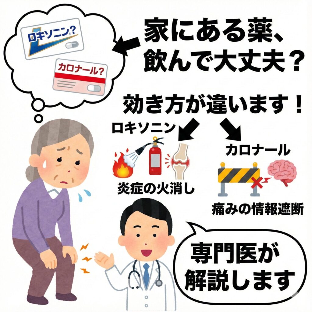 「先生、家にあるロキソニンを飲んでもいいですか?」 「以前もらったカロナールが残っているんですけど、膝の痛みに効きますか?」