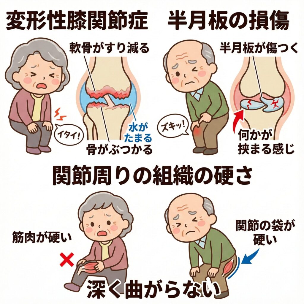 「もう年だから仕方がない」と諦めてしまう方もいらっしゃいますが、実はその痛みには明確な理由があり、適切な対策を講じることで、膝の曲がり具合を改善したり、痛みを和らげたりすることは十分に可能です。