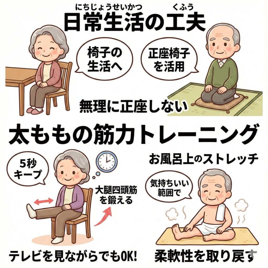 生活スタイルを「床に座る」形から「椅子に座る」形へシフトすることをおすすめします。どうしても正座が必要な場面では、正座椅子(お尻の下に置く小さな台)を活用しましょう。これを使うだけで、膝への荷重が劇的に減り、関節への負担を抑えながら正座に近い姿勢をとることができます。