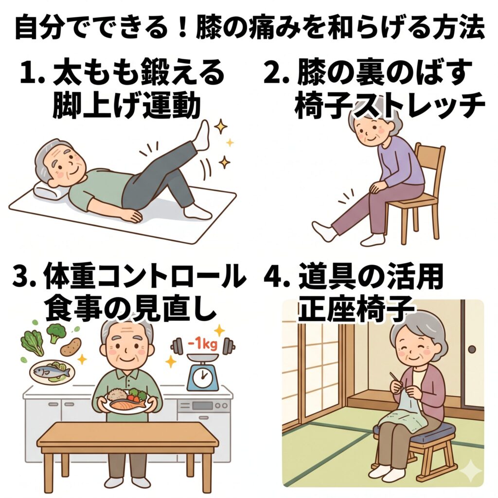 和室での生活から洋室での生活へ:布団からベッドへ、床に座る生活から椅子に座る生活へ変えるだけで、膝の屈伸回数が減り、保護につながります。 適切な靴選び:クッション性の高い靴を選び、足元からの衝撃を和らげましょう。 温めるか冷やすか:お風呂上がりなどに膝が重だるく痛む場合は、ゆっくり湯船に浸かって温めるのが効果的です。血行が良くなり、筋肉の緊張がほぐれます。ただし、熱を持って腫れているときは冷やしたほうが良い場合もあります。