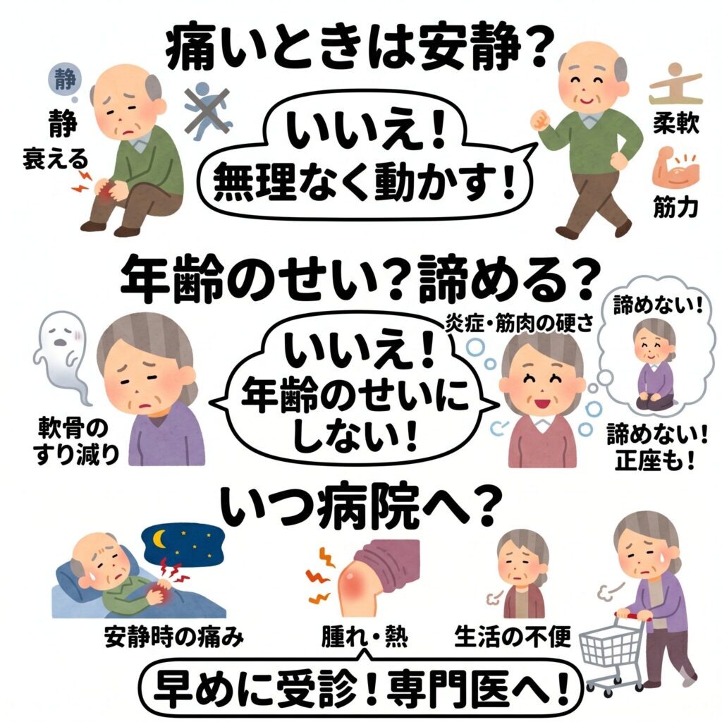 確かに年齢とともに軟骨は変化しますが、痛みの原因は軟骨の減り具合だけでなく、周囲の炎症や筋肉の硬さも大きく関係しています。それらを適切にコントロールすれば、たとえ軟骨がすり減っていても痛みをゼロに近づけ、正座ができるまで回復する方はたくさんおられます。諦める必要は全くありません。