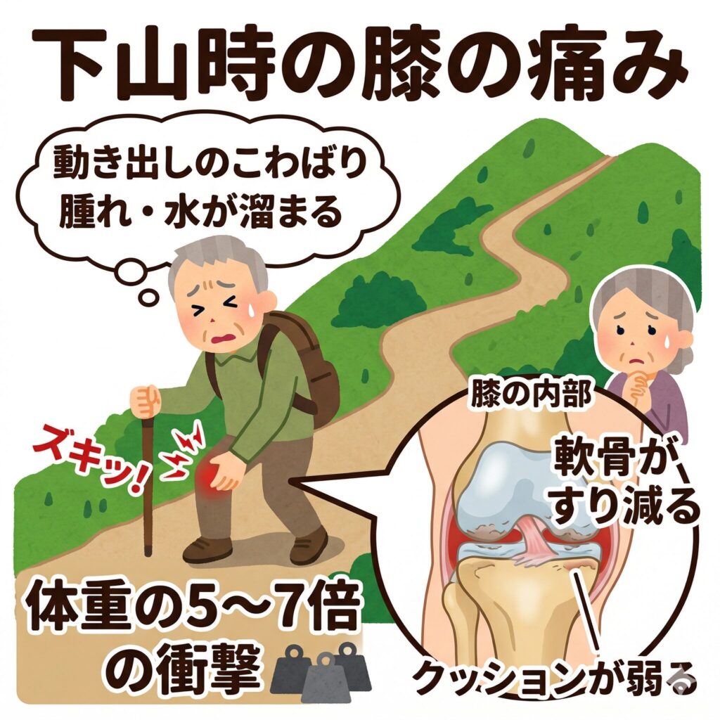 山登り、特に「下り」の際に膝が痛むというのは、変形性膝関節症の典型的な症状の一つです。なぜ平地を歩くときよりも、山道では痛みが強く出るのでしょうか。