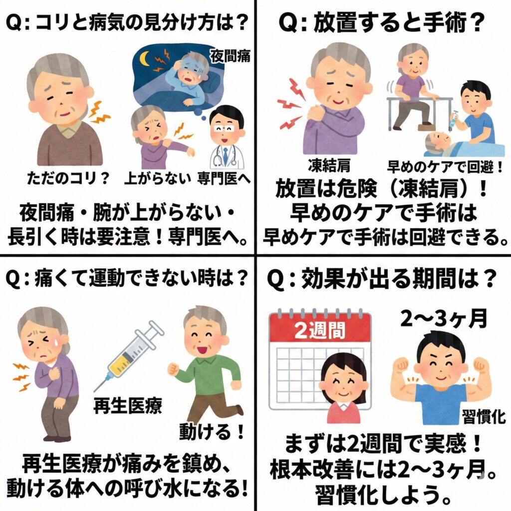 放置して関節が極端に固まる(凍結肩)と、リハビリだけでは改善が難しく、癒着を剥がすような処置や手術を検討せざるを得ない場合があります。しかし、そうなる前に適切な治療とリハビリを行えば、多くの方は保存療法で改善します。再生医療も、炎症を抑え自己修復力を高めることで、手術を回避するための有力な選択肢となります。「年のせいだから」と諦めず、早めに対処することが将来の自由な動きを守ります。