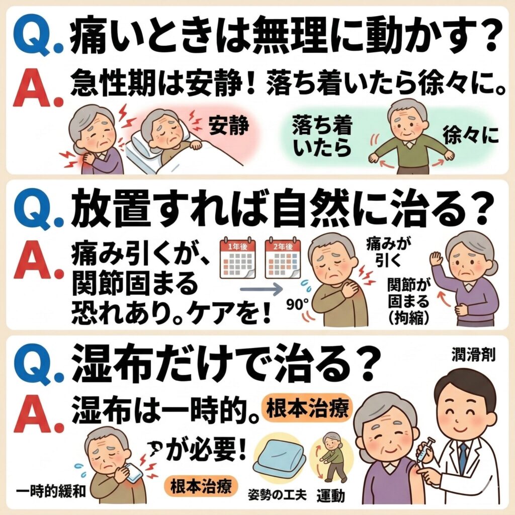 Q. 四十肩・五十肩は放っておけば自然に治ると聞きましたが、本当ですか?