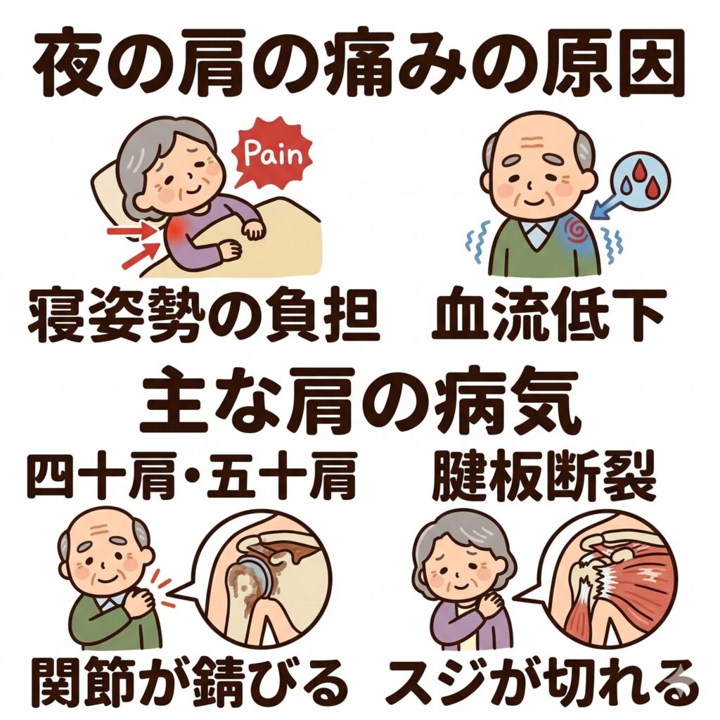 もう一つは、血流の変化です。夜、体がリラックスして体温が下がってくると、血の巡りが変わり、痛みを感じさせる物質が肩の関節の中に留まりやすくなります。